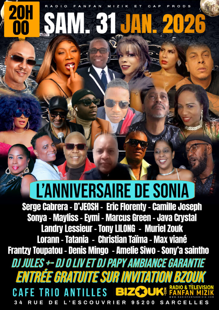 Le samedi 31 janvier 2026, le Café Trio Antilles vibrera au rythme d’un événement d’envergure : l’anniversaire de Sonia, organisé par Radio FANFAN MIZIK en collaboration avec CAP PRODS.